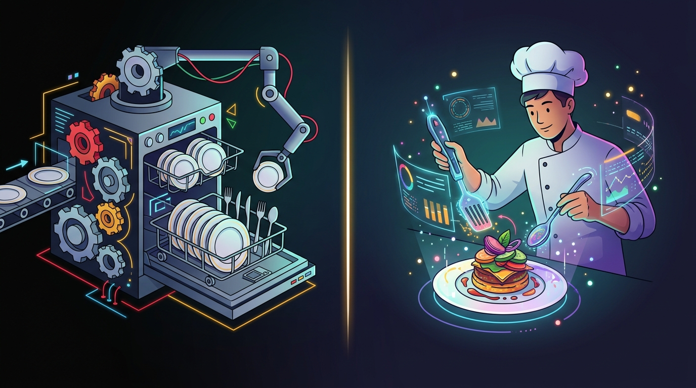 Your dishwasher is automation. You load it, hit start, and it runs the exact same cycle every single time. Hot water, detergent, rinse, dry. It doesn't care what's in there. It doesn't adjust if you put in a delicate wine glass. It follows its program — and that's it.