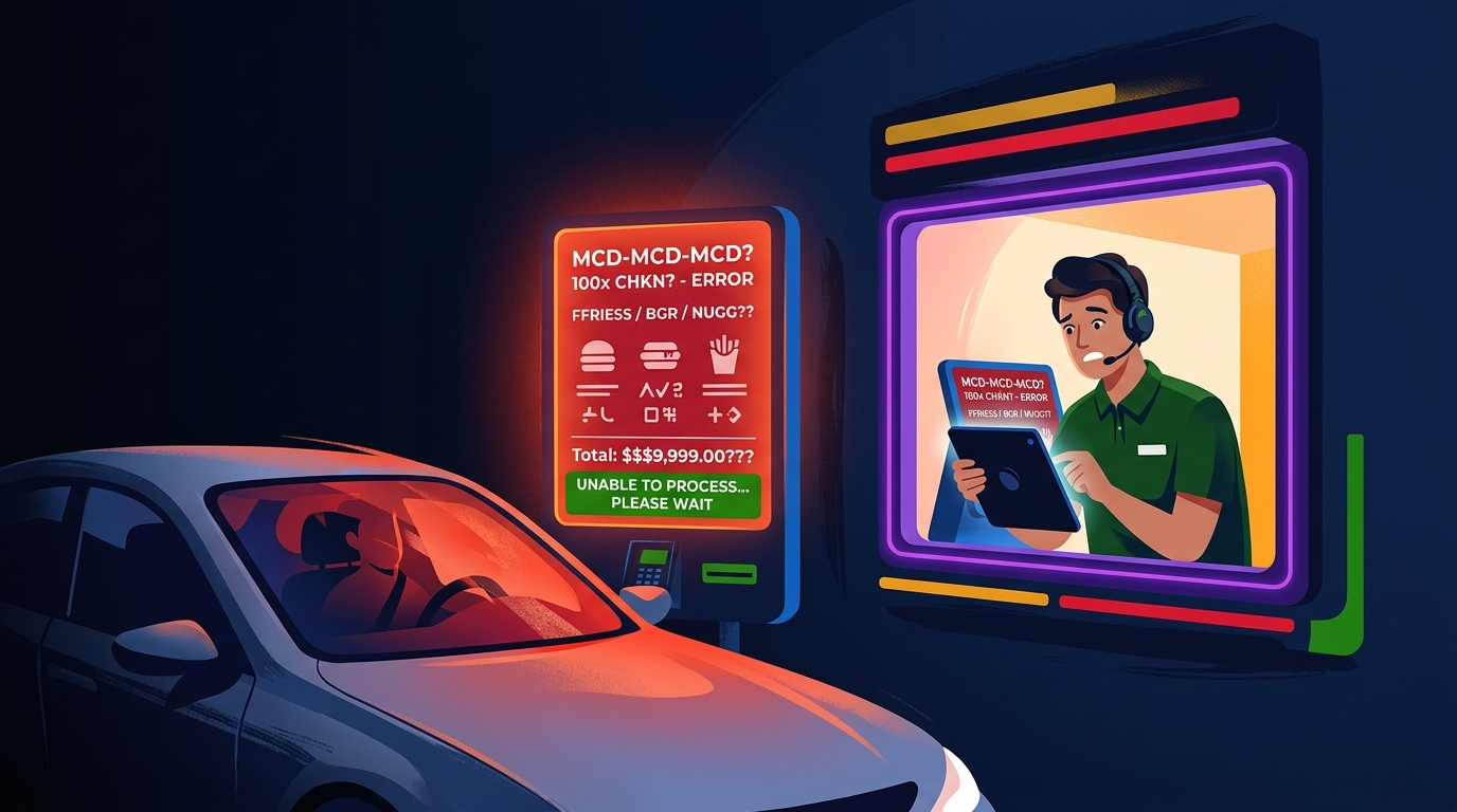 The AI added bacon to ice cream orders. It couldn't handle accents. It got confused by background noise — the kind of background noise that exists at literally every drive-thru on Earth. Customers posted videos of the system adding hundreds of dollars of chicken nuggets to their orders.